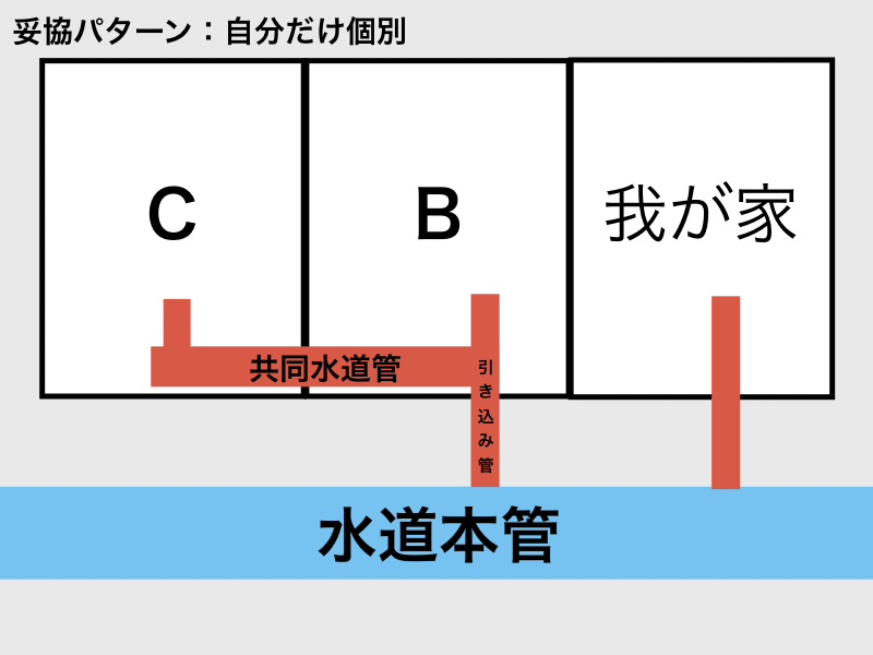 これによって将来B・Cが個別に水道管を引き直したときに、共同水道管やめる時の工事がスムーズに進むからだそうです。